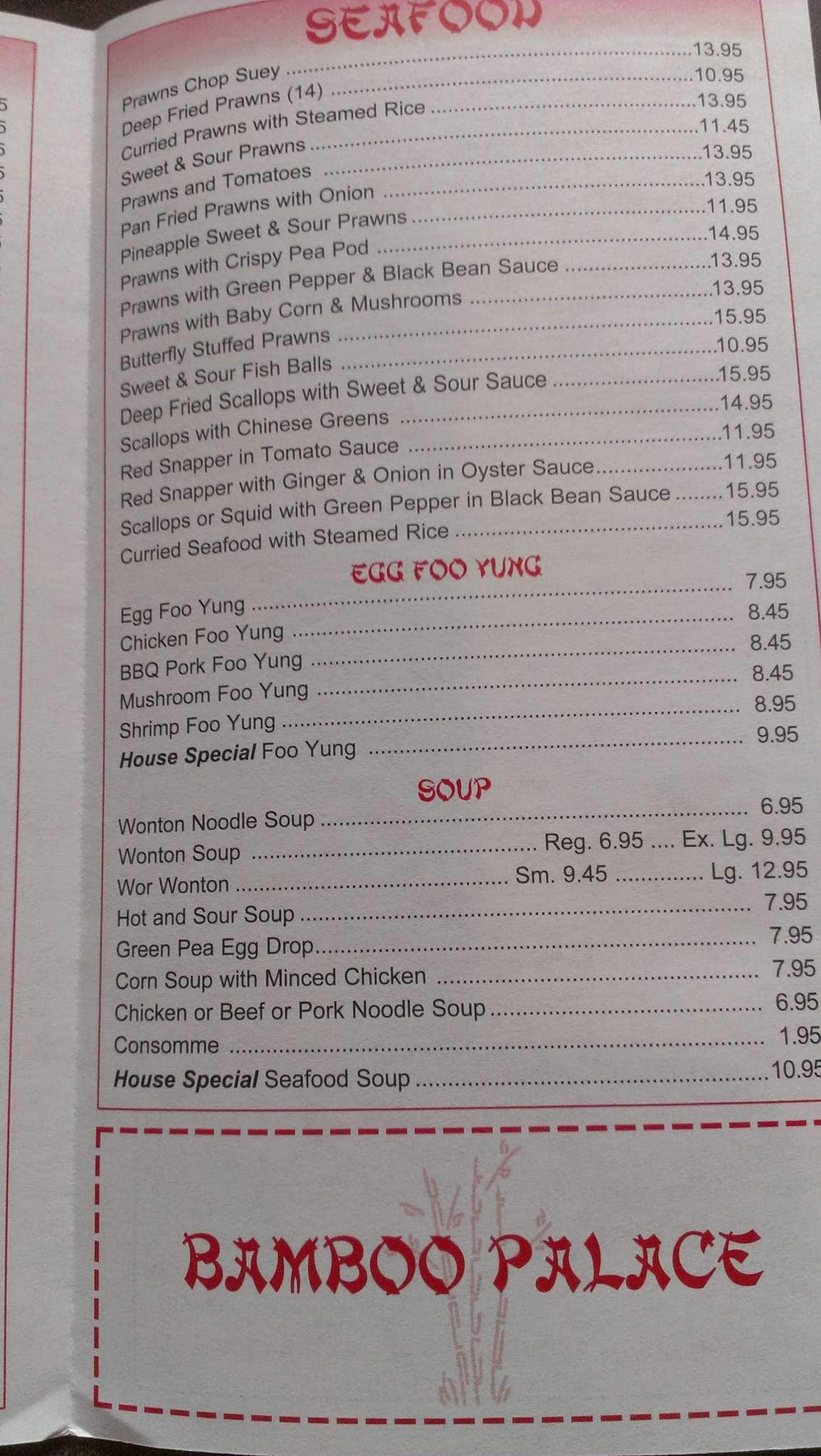 So disappointed. Have been going to Bamboo Palace for years and was always very satisfied. This last time the prawns were just thick pieces of dough, the chicken chow mein was flat tasting and very dry. The sweet and sour was yellow, not the usual bright red it’s always been ... and it too was very dry and no sauce to speak of. Very, very disappointed. Don’t know if a new cook or they’ve changed hands or what. Read more