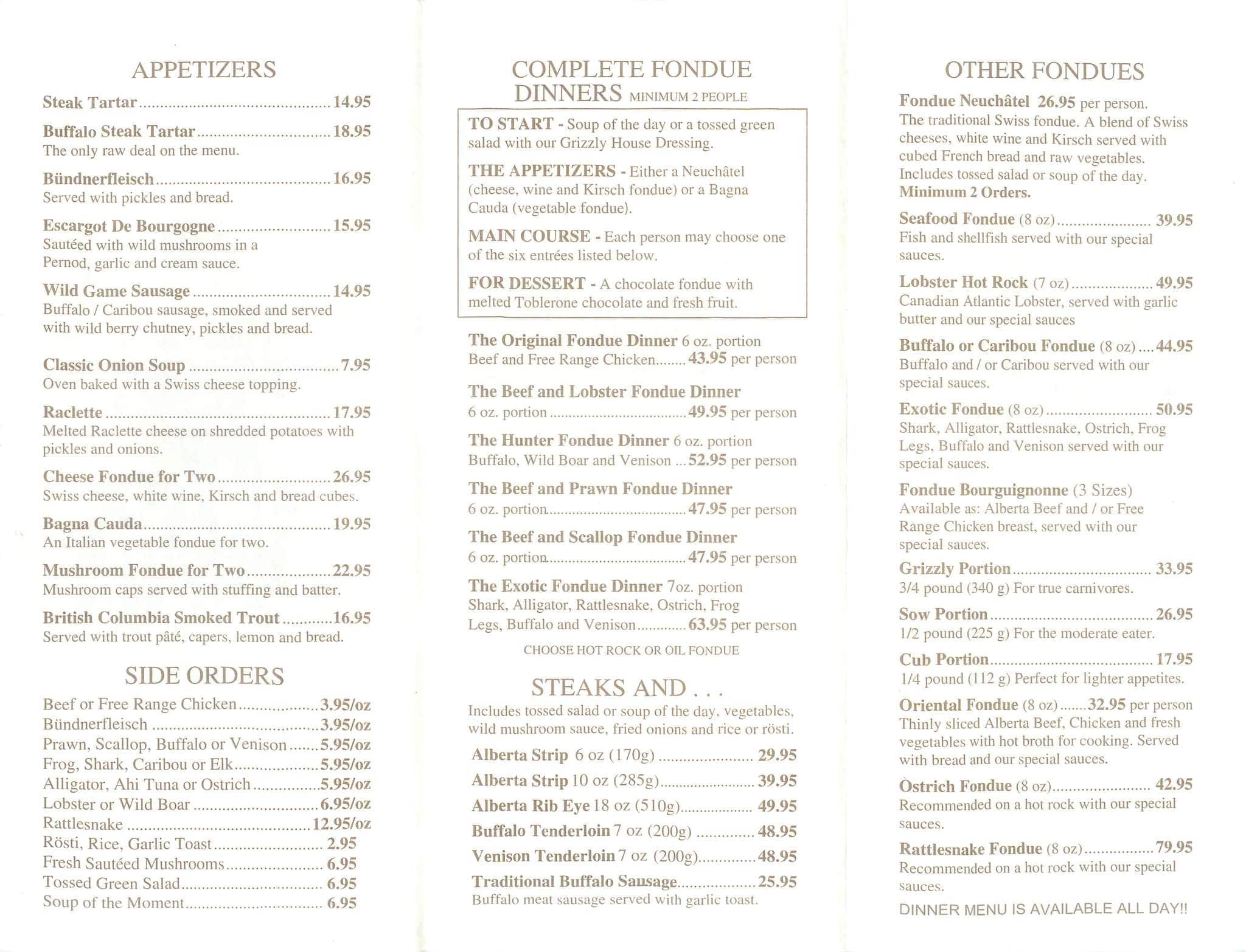 This place is great if it fits within your budget. I’ll preface this by saying it’s not cheap by any means. It was a great first time experience to try many different types of meats such as kangaroo, alligator, & ostrich. We ordered the exotic fondue dinner and the Alberta ... dinner (not on menu but incl. beef, boar, elk and venison). The interior is a nice cozy and dark vibe unless you sit by the exterior windows, where you get a nice view of the beautiful mountains. The chicken tortellini soup was immaculate, lightly salted and the perfect temperature. The cheese fondue was a nice, cheesy and had a strong wine tasting undertone. The fondue dinners were great, meat was tender, good cuts, no cheap/fatty bits. The stone was nice and hot to cook the meat on. And I sure smelled like a barbecue after that. The chocolate fondue was the perfect way to end off the night. It was perfectly sweet (not too much, not too little) and some yummy fruits! I would definitely say this place is a must. Read more
