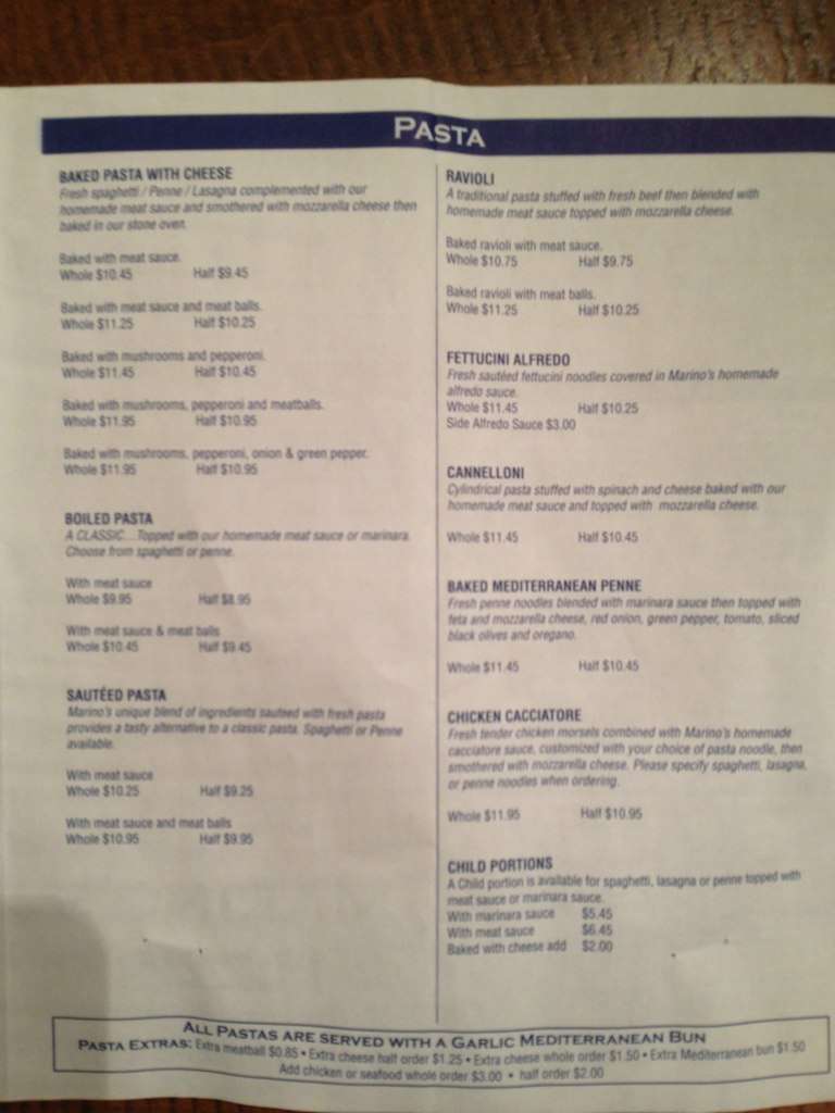 Food was great - had a Classic pizza and a Marino's Pita with meat sauce on the side. Service was excellent. Do not expect to pay the prices on the website - they are considerably higher. For example, the whole pita was $21.00, not $18.75, the meat ... sauce was $3.00, not $2.50. I told our server they needed to update the prices on the website and she said they have told the owner, but nothing happens. Read more