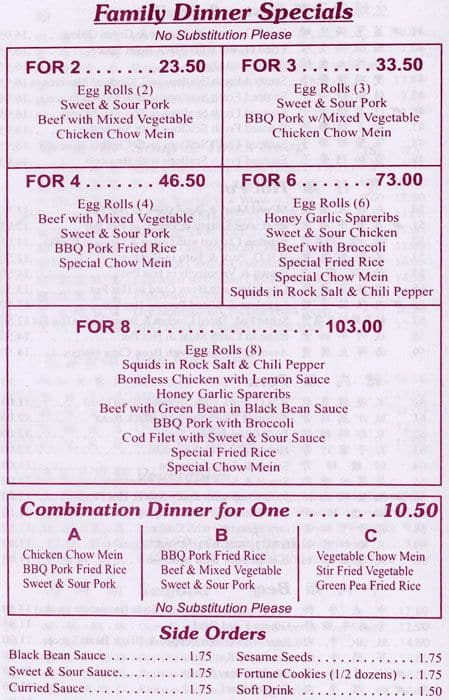 Cozy family-run business, the boss and his two sons. Even tho it gets busy at lunch time, they get to your order very quickly. They have a wide selection of lunch specials at a good price. I'm a fan of their Wonton Lo Mein and House Special Chow Mein.