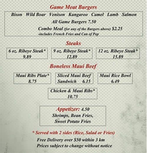Tried the Kangaroo Burger. Meat was dry because Kangaroo meat is super low in fat. So not that juicy. Taste is okay. Customer service was good and friendly. Will try other game meat next time. If you workout and want low fat meat with good protein, give ... Kangaroo meat a try. For big guys, I would say a double to triple Kangaroo patty burger with LOTS of BBQ sauce would be best. Read more