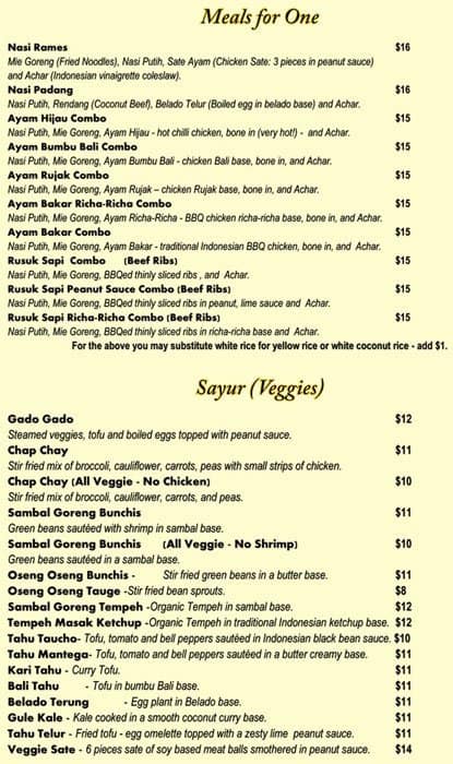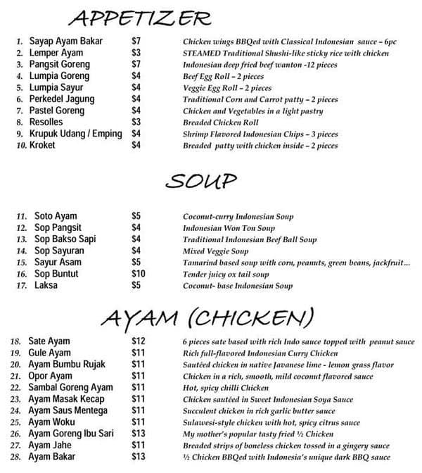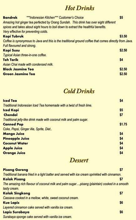 We went to Indonesian Kitchen for the first time today. The restaurant has a nice decor. The variety of food on the menu was great. We tried the Sop Pangsit, Rendeng, and Nasi Goreng Special. They were spicy to our liking. We found the Rendeng to have a small portion ... compared to the price ($17). We wanted to have their other famous items, but since they were close to their closing time, they were out of them. We want to try their famous Soto Ayam, Nasi Rames and BBQ meal in the near future. Read more