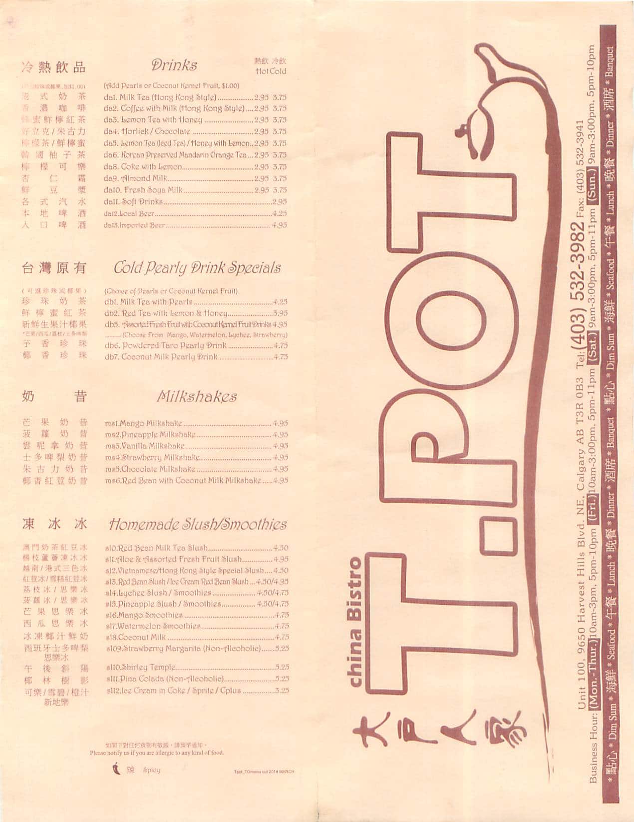 We visited T.Pot Chinese Restaurant for dim sum on a Tuesday afternoon around 11 AM, and it was extremely busy, which was quite surprising. We had to sit in the area to the right of the entrance, which is mainly for the Hong Kong Café, as the main dining room ... was full. The ordering process was through a sheet of paper, which seems to be the new modern style. We were a group of three and ordered several portions, which was more than enough—we even had leftovers. Coming from Toronto, I had high expectations for dim sum, and this restaurant exceeded them. The taste was great, and the value for money was excellent. We ordered the usual items like har gow, siu mai, rice noodle rolls, and barbeque pork buns. Everything was delicious. I would particularly recommend the sesame balls—they were massive, crispy, and absolutely delicious. Another standout was the stuffed jalapeño peppers; they were super spicy but incredibly tasty. The restaurant itself is very modern and clean. I highly recommend T.Pot to anyone looking for good dim sum in Calgary. I will definitely be back whenever I’m in Calgary again. Read more