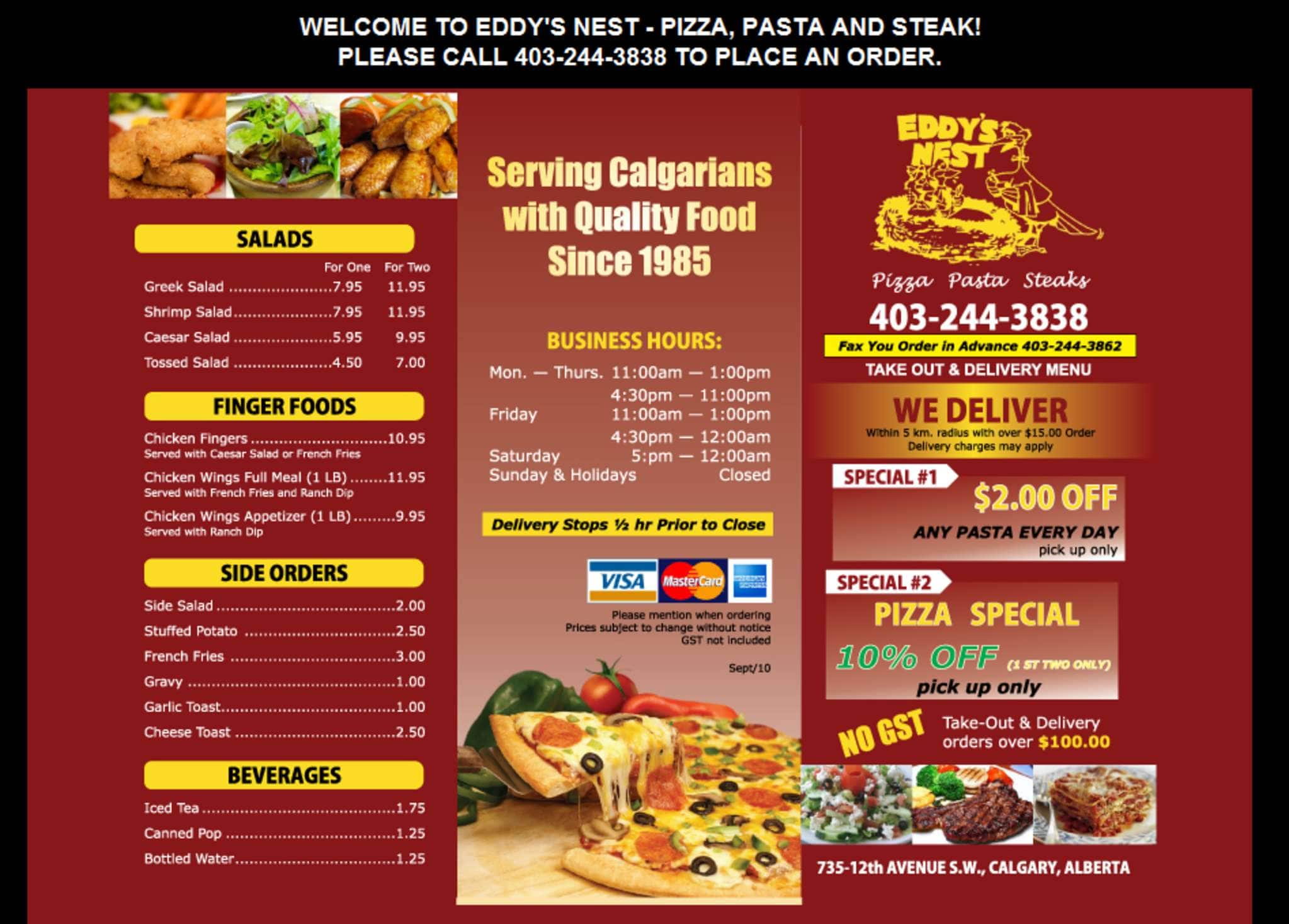 Eddy’s Nest Restaurant & Pizza is Calgary’s hidden gem, offering a delightful dining experience that combines homey comfort with culinary innovation. Renowned for its mouthwatering pizza, the menu also boasts a variety of expertly prepared dishes that cater to all tastes. Whether you’re a local or just passing through, Eddy’s Nest guarantees a warm welcome and flavors that will bring you back for more.
