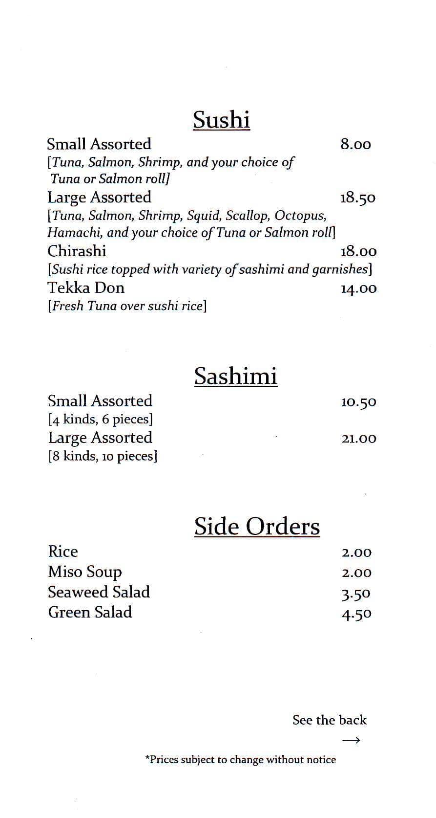 Not sure why this place is rated $$ for prices, the prices definitely are not $$ especially compared to the quality and size of the portions. Price wise it's more of a $$$$ while the sushi and sashimi are small and thin. Food quality was ok; nothing special to be honest ... and there are many places that are better in quality and portion sizes. $25 for 7 piece sushi and $29 for 7 pieces of very small and thin sashimi. You'd expect for $29, the sashimi slices would be thick - they are not. Rolls are overpriced and small as well. Service was great though, no complaints whatsoever but we were also the only table from 6pm to 730pm. The atmosphere is fine. My only complaint here is that the ventilation is poor so as soon as you walk in, all you can smell is a smokey kitchen. Definitely do not recommend wearing your best outfit here as you will need to wash as soon as you get home. Read more