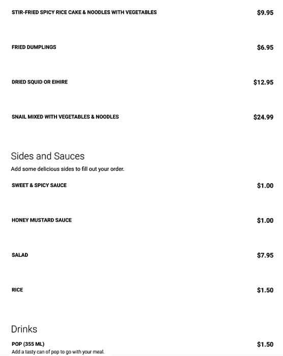 Great food and great service! I ordered the bbrinkle boneless chicken with the fried rice cakes, and they were very tasty! The chicken was juicy and had lots of flavour. The rice cake was crispy on the outside and chewy on the inside. The service here was very fast and ... nice. They provided a good variety of side dishes and it tasted fresh! Read more