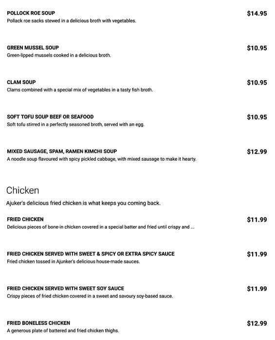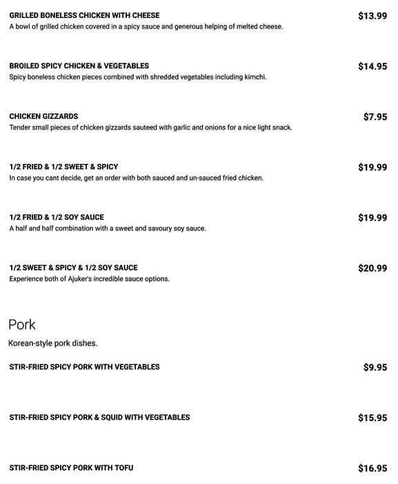 Ajuker fried chicken served a large variety of traditional Korean food from Korean fried chicken, to soups and hot pot, japchae, tteokbokki, and etc. There is the standard complimentary side dish which we were able to refill for fresh. Food came out fast and hot. Booth style seating made it ... slightly difficult to fit 5 people in with all the food that we ordered, but we managed. We ate a variety of dishes and it was a good price costing us only $20 at the end. Parking lot is small and is shared with other businesses. Read more