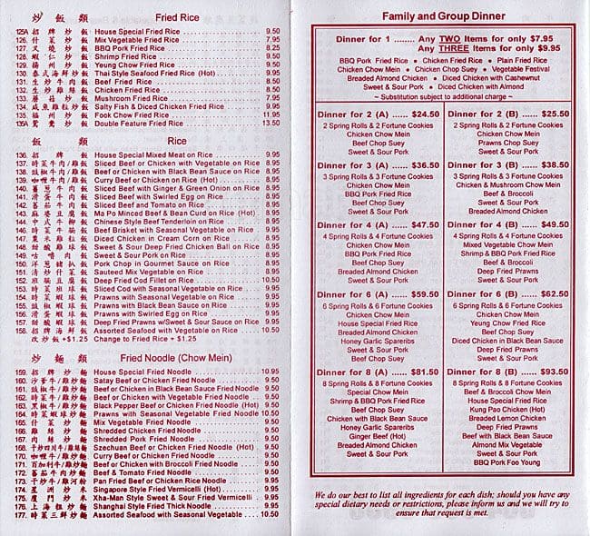 This used to be our family's go to takeout chinese food restaurant. Not sure if they changed owner's or what happened. We had family in from out of town and ordered the large family combo dinner. When we brought it home everything was cold, the fried rice had a very ... long black hair intertwined throughout the dish. The beef and broccoli had a few small pieces of steel wool in it. The portions are a lot smaller and very little meat was in the dishes. For the amount of money we spent for basically a lot of rice and noodles it's hardly worth it. We're now on the search for a new Chinese restaurant. Read more
