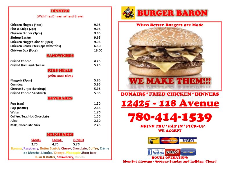 Burger Baron in Edmonton, Alberta, Canada, is a beloved local eatery known for its delicious and hearty burgers. Serving a wide variety of mouthwatering options, from classic cheeseburgers to their unique signature creations, it’s a must-visit spot for anyone craving quality, flavorful fast food.