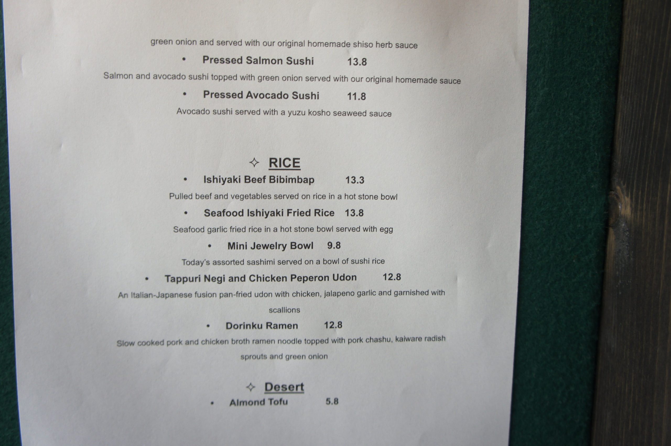 A nice place to enjoy some fresh and authentic Japanese food. We ordered some Mixed Sushi, Chicken Karaage, Ishiyaki Beef Bibimbap & Ramen Salad. Everything tasted delicious and food was served rather quickly. Server was very friendly and polite. Ambience was lively.