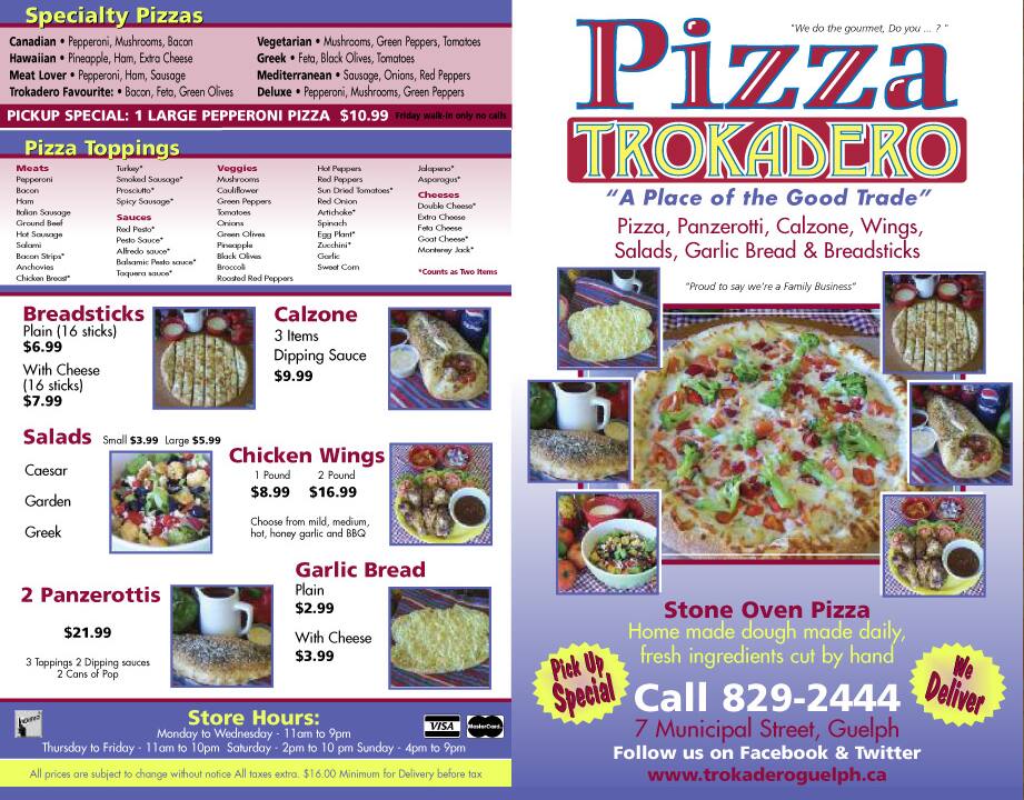 Trokadero Pizza in Guelph, Ontario, is a cherished local eatery renowned for its sumptuous selection of pizzas. Here, each pie is crafted with a unique blend of fresh ingredients and traditional techniques that promise a delightful culinary experience. Whether you’re craving a classic Margherita or feeling adventurous with their gourmet options, Trokadero Pizza offers a warm, welcoming atmosphere that is perfect for family dining or a night out with friends.