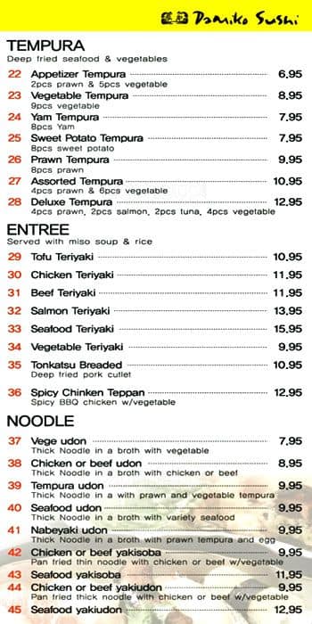 I recently moved to langley a few months ago and one day I was craving sushi and stumble upon Damiko! Everytime I visit, the staff are always so kind and cheerful which always makes my day. The food is also really good and always satisfies my cravings. They also ... have korean food on the menu which is great because I love korean food! Check it out when you're in the area! Also Leona was great! Thank you for your kind service! Read more
