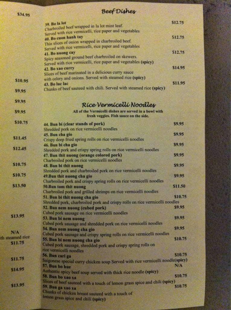 I ordered sate beef soup and pork vermicelli for delivery today and got a regular soup instead with no sprouts or hot sauce that I asked for when I placed order. Regardless, the broth was ok but the noodle portion was way too small. I had 3/4 of soup left ... when I poured it inside the noodle bowl because the noodle bowl is as tall as 5inches and not the wide bowl either (small container, a cup bowl) For pork vermicelli, it was very boring they put little bit of lettus and cucumber with what appeared to be chopped off "spam" ham. When I called back to let them know I had ordered sate and they forgot the sprouts and the hot sauce they said, "we don't have sprouts, and yes I forgot the hot sauce. What do YOU want me to do about it?" Dont waste your money here, I'm never ordering anything here again :) Read more
