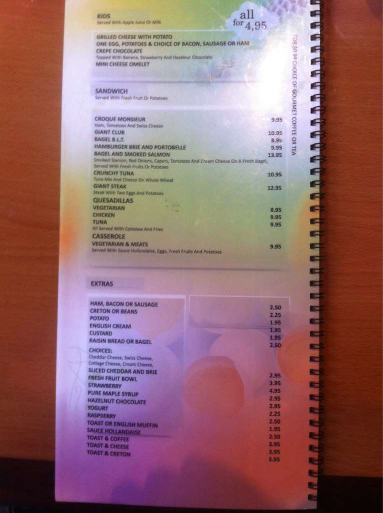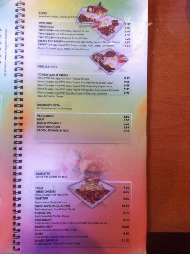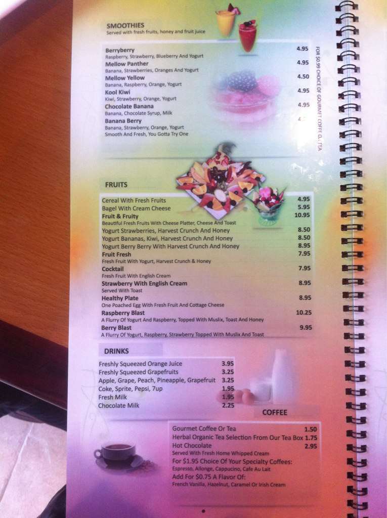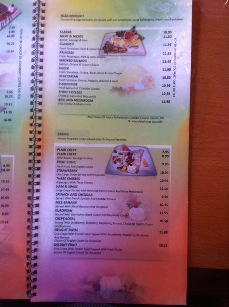Nothing in their menu is over 15 dollars, their portions are pretty big, lots of fruit. Some dishes come with a variety of fruit, some come with only one or two types. This place does Uber eats and skip the dishes for delivery, is awesome for that. I love this ... place, never had a crape before until here. I would definitely recommend this place over Cora's which is over priced portions are small(for what you pay for) and they give you little fruit which is usually not that fresh. Would recommend!! Read more
