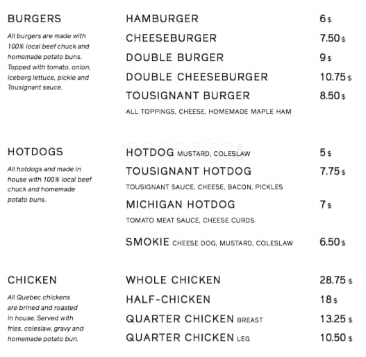 Chez Tousignant is a gem nestled in the heart of Montreal, known for bringing the classic casse-croûte (snack bar) experience to a whole new level. This cozy eatery celebrates Quebec’s culinary traditions, featuring a mouthwatering selection of homemade hot dogs, burgers, poutines, and more, all prepared with a touch of modern flair and locally sourced ingredients. It’s a go-to spot for anyone craving authentic flavors in a comfortable, nostalgic setting.