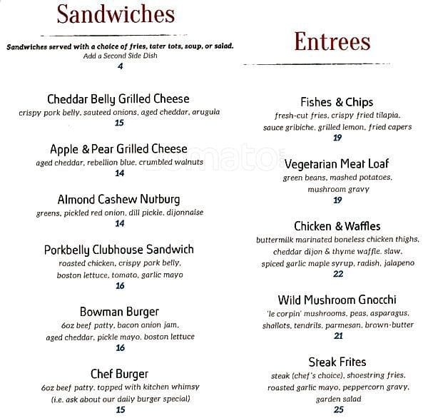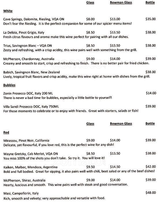 Bowman's is where quality shines. It's a laid back, relaxed pub with a small menu of pub classics. But this place is definitely a matter of quality over quantity. Everything they have they do exceedingly well. They offer specials in addition to their menu items, as well as different desserts. The ... staff are fantastic. They always greet you like you're an old friend and their attentive service makes you feel like you're important to them. The bathrooms are small but are always clean and well stocked. I highly recommend their Bowman burger and their dill-icious pickle chips (starter). Read more
