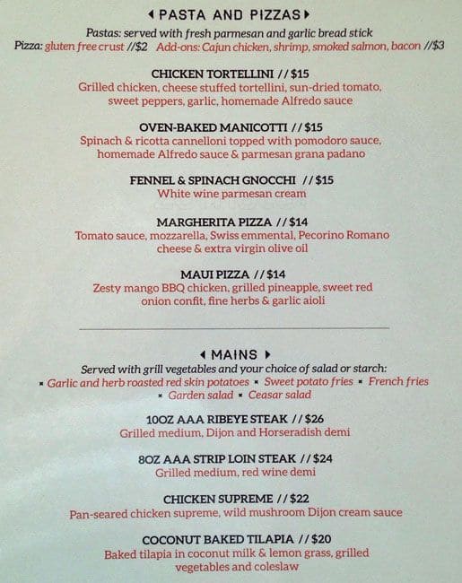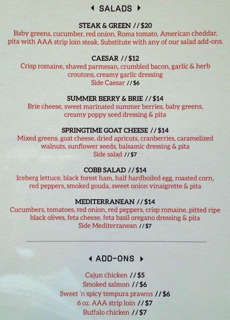 I ordered the salmon. For $27 what I got was: a 1" wide trimming of salmon (I ordered medium but this was cooked past well done, more like you get in a can), two mini-potatoes cut in half, half an asparagus (from the tough wood-like end, not the tips), some ... toasted nuts, and some spinach leaves. The portion was smaller than a lot of appetizers. I bought two cheeseburgers from Mcdonalds afterwards, which I recommend ahead of this place. Read more