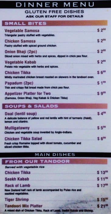 A few vegetarian options. The appetizers were quite small for the price. I liked the paneer massala the best. The gulab jamun desserts are delicious.