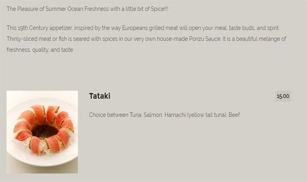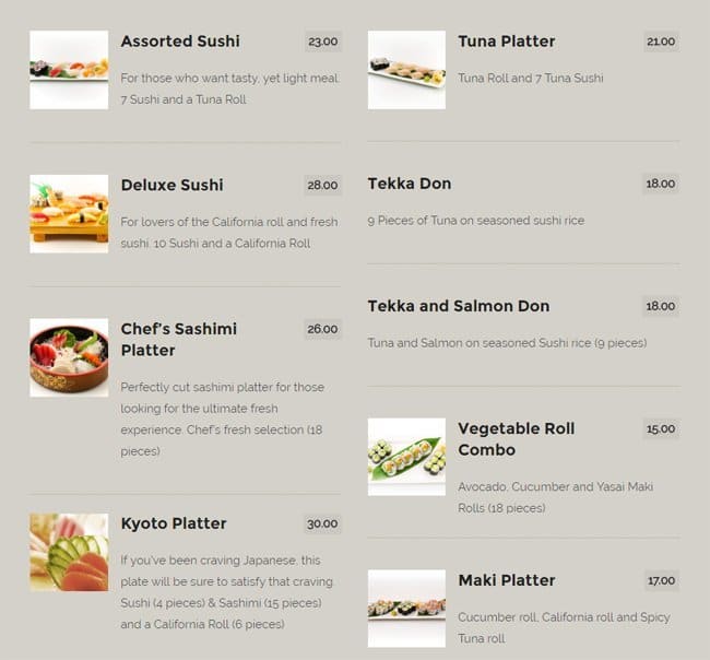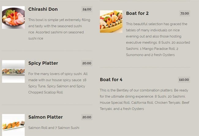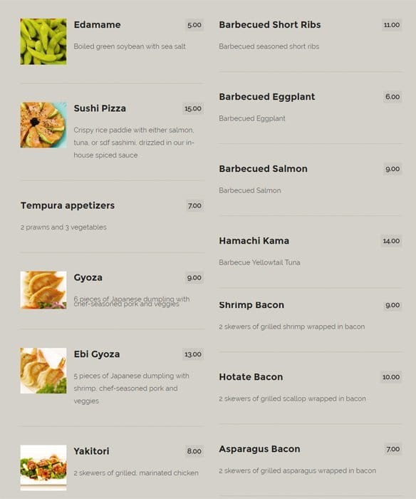 Some of the best sushi in Ottawa, great service, good atmosphere, decent sized boats and excellent tempura. Prices are also atmospheric if you are comparing it to sushi places in Vancouver or Toronto. That being said - for the quality the prices aren't worse than their local Ottawa ... competition. Read more