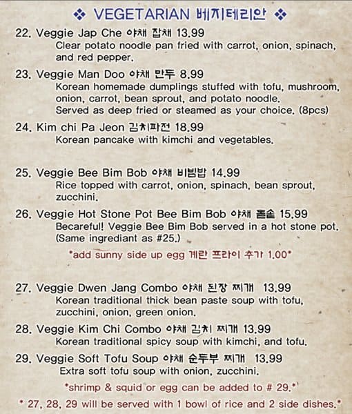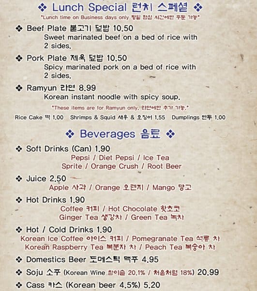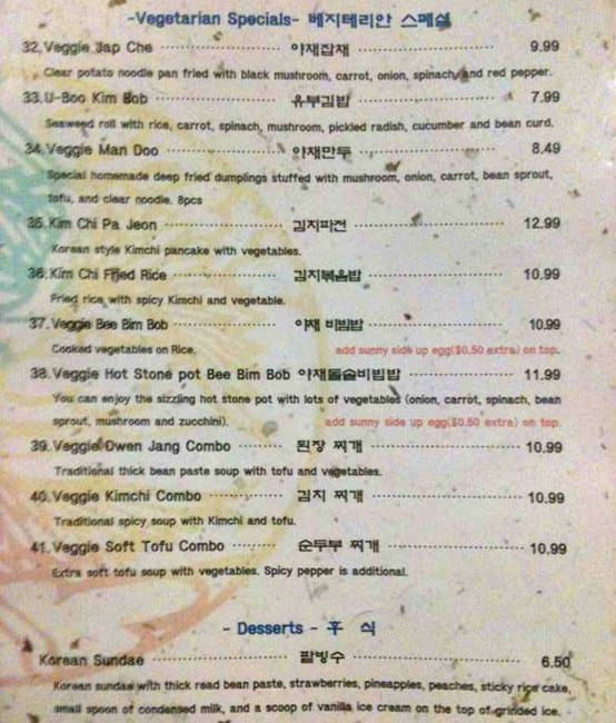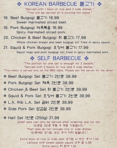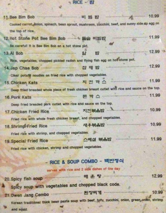 The food is very good. Exactly as one gets in Korea. By far the best in town. The atmosphere is that of a small mom and pop restaurant with friendly service. The Kimchi is so good I buy it by the litre and take it home to go with my ... morning eggs. Read more