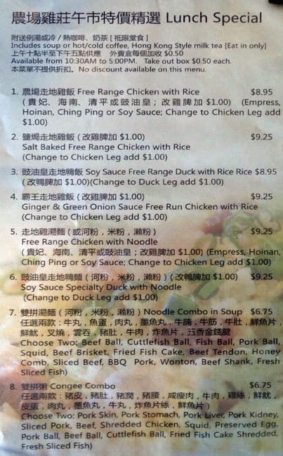 I had their Free Range Hainan Chicken Meal with soup and upgraded to yellow oil rice for an extra dollar. The meal cost $15.85 before tips. This place is decent and serves traditional Cantonese food including steamed tilapia and has so many types of chicken available. The presentation was good. The ... soup was delicious with pork bones and meat and tasted very homemade and hearty. The yellow oil rice was soft, fresh and flavorful. The free range Hainan chicken was quite overly salty but otherwise had good flavour and came with some veggies and roasted peanuts. Overall, good chicken and rice but just a bit too salty taking away from the enjoyment of the chicken flavor. Read more
