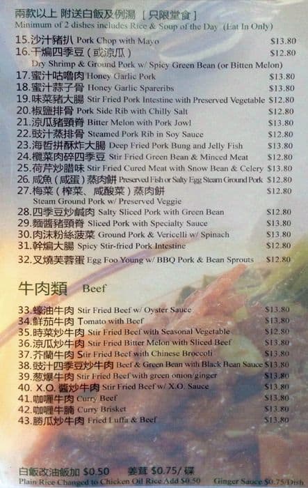 Entered the restaurant with my vaccination card but the lady worked there said sorry new rules, she had to see my vaccine QR code instead. So fine, as I had this downloaded as well. I then showed her my QR code and she "scanned" it with her eyes and asked ... my id to match that- such high tech! The dinning area was actually quite large and there were only 3 tables of guests. But instead of being placed with a distance with the customers, the waitress decided to put me adjacent to the others, which I did not like. There were 2 people working as waiters, bussing as well as serving the take-out customers. I saw both of them using the same gloved hands handing the food to me right after clearing the other tables! I ordered chili pork chop and fried 4 season beans with 2 bowls of rice, total damage was $28.50. Food was just average. I will go some place else with better conscience about food-safe handling. Read more