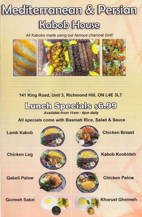Discover the authentic flavors of the Middle East at Mediterranean & Persian Kabob House in Richmond Hill. Our restaurant prides itself on serving up a delectable range of kabobs and Persian specialties, crafted with the finest ingredients and traditional cooking techniques. Whether you’re in the mood for succulent meats, aromatic rice dishes, or fresh vegetarian options, our menu caters to all tastes. Join us for a culinary journey that promises to delight your palate.