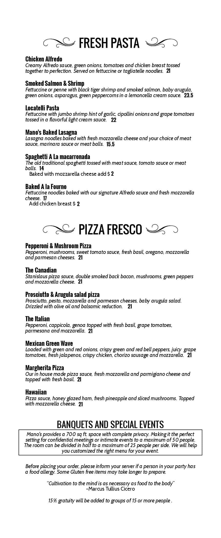Mano’s Restaurant & Lounge in Saskatoon is a beloved dining destination, offering a cozy ambiance perfect for any occasion. Renowned for its extensive menu that features a delightful mix of classic dishes and innovative creations, every meal at Mano’s is a culinary adventure. Whether you’re craving succulent steaks, fresh seafood, or irresistible pasta, Mano’s welcomes you to relax, dine, and enjoy the exceptional service and atmosphere.