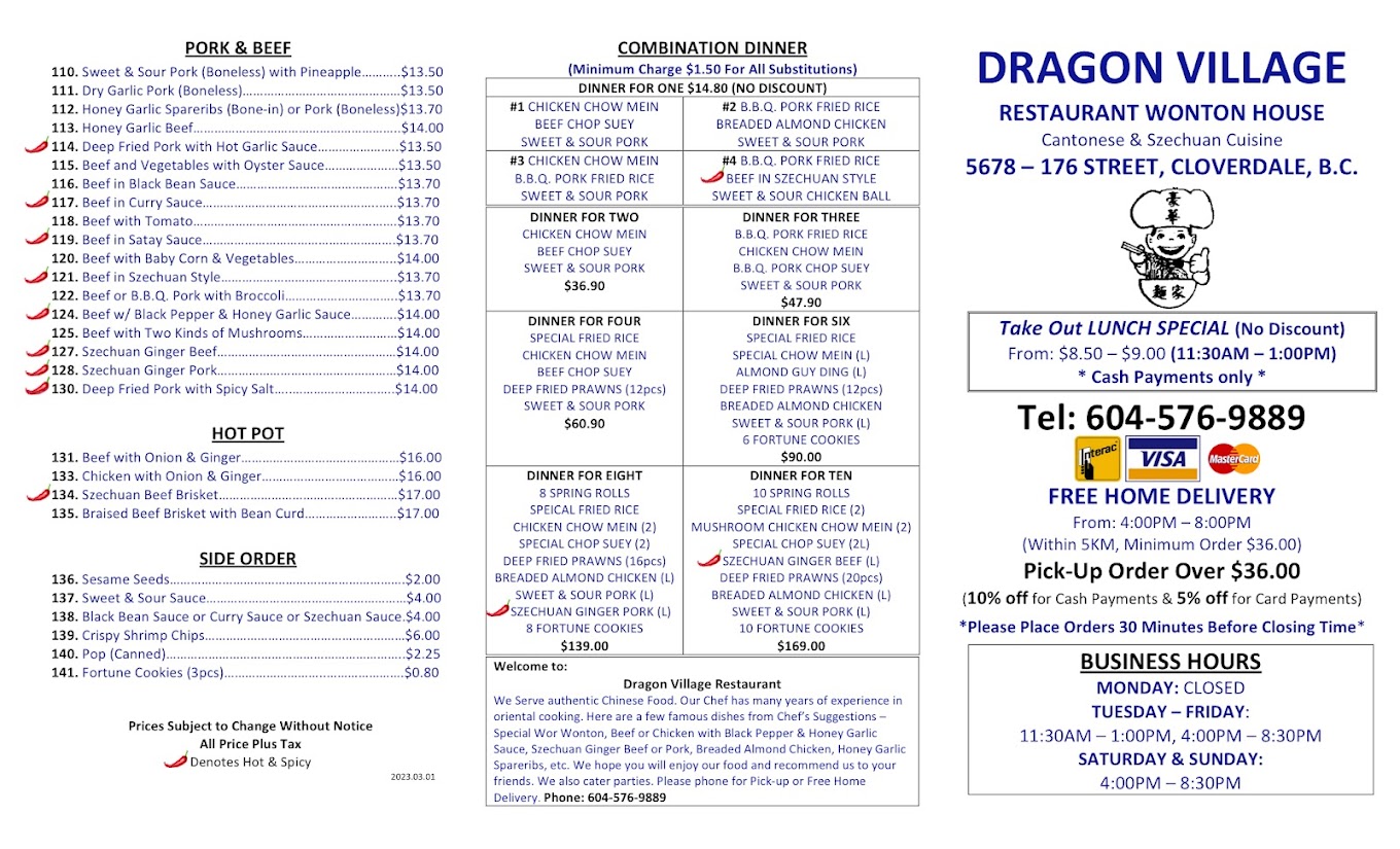 Dragon Village Restaurant is a beloved culinary gem nestled in Surrey, British Columbia, offering a delightful journey through authentic Asian flavors. Renowned for its extensive menu that features a wide range of traditional dishes, from succulent dim sum to savory stir-fries, each meal is crafted with fresh, high-quality ingredients. The warm, inviting atmosphere, combined with exceptional service, ensures a memorable dining experience for families and food enthusiasts alike.