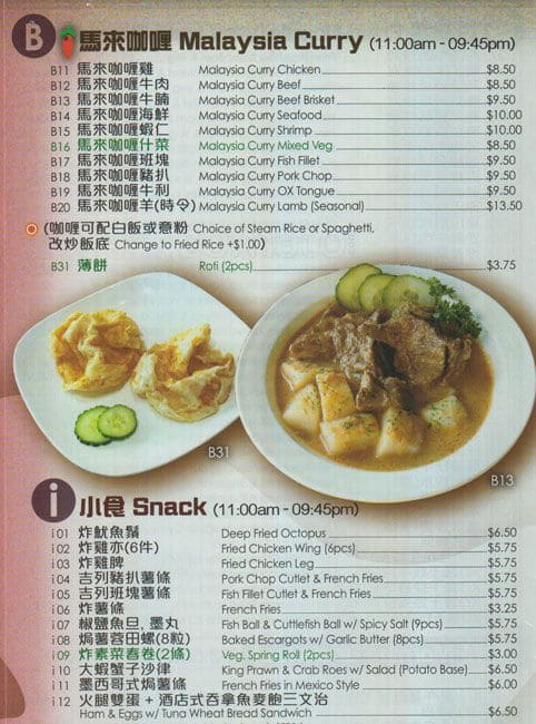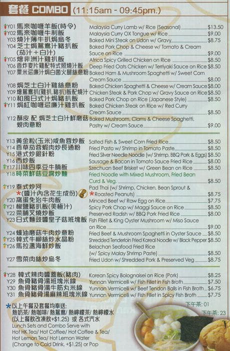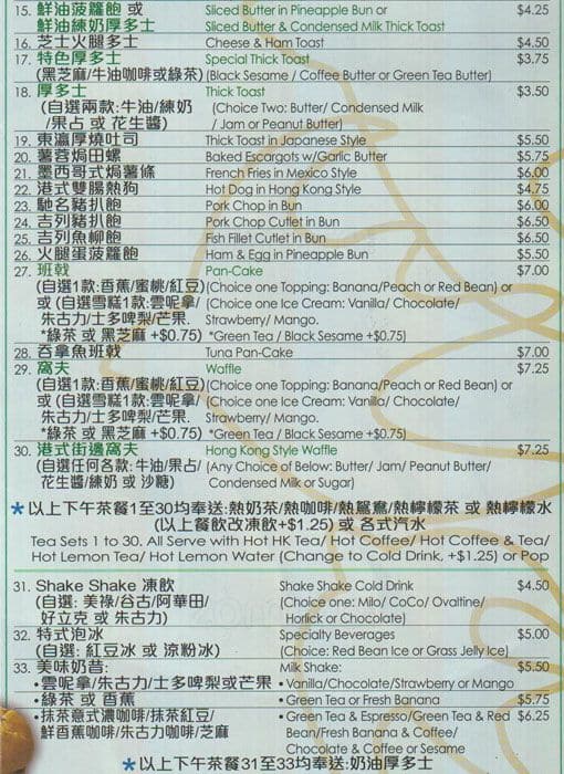 Hong Kong style dishes. Great for small groups for breakfast, lunch, afternoon tea, dinner or dessert. Portions are big for average person to get full and prices are reasonable. Kitchen is fast and meals are served fresh and hot. Desserts are yummy and lots to choose from ... on the menu. Meal or dessert? You choose! Read more