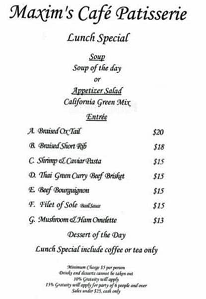My friend took me here for my birthday lunch as per my suggestion. We ordered the set lunch which included a soup or salad, main dish and dessert with coffee or tea. We both had the minestrone soup, and followed with the pork chop on fried rice and the ... Malaysian Curry Beef brisket with rice. The food was all delicious. I asked the male server if we could share one slice of the Meringue cake instead of having the 2 desserts that came with our set lunch. He responded no and that the Meringue slice would be $7.00. I said that was fine and we would take our 2 desserts to go. He then told us it would be $0.35 for the desserts as takeout? When I got home I noticed there was only 1 dessert/eclair instead of the 2 that should have been included with the set lunch. Not impressed with the service. Read more