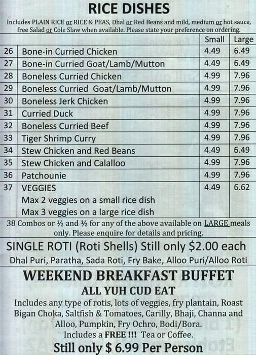 Some of the best Trini food I have had in all of Canada. Tastes like my momma made it. All food tastes fresh made and pricing is super reasonable for Canada. Doubles are great, stew chicken is great, curry shrimp is great, and obviously roti is delicious. Always ... happy to stop by an get some good cooked food. 100% recommend. If you come to try new things, don't be afraid to ask for recommendations from the cooks inside. Always friendly too! Read more
