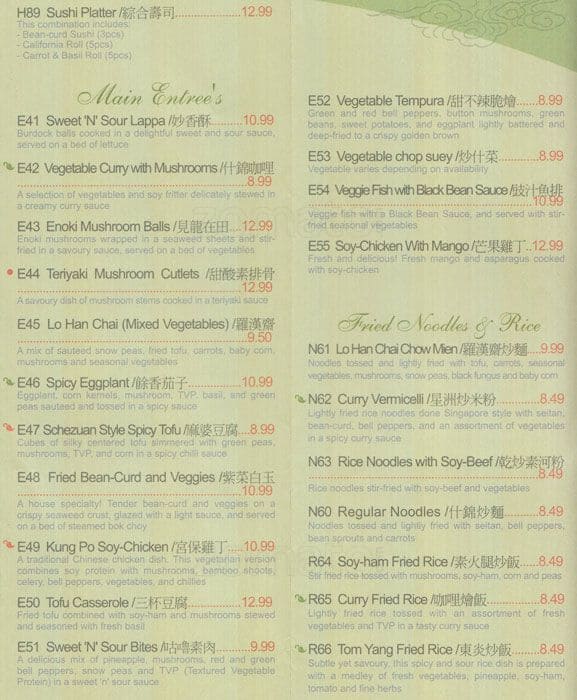 We have been visiting this place for years, and while living in another country I missed this place quite a bit. We had the pleasure of returning to it today and it was as good as ever. It’s totally vegetarian (with a little shop within if you like any of ... their faux meats and want to take some home). Today we got the chicken, broccoli and mango in sweet and sour sauce and some curried vermicelli, with shredded soy chicken. Both were excellent. There’s also a small selection of vegetarian sushi and some dim sum small plates should that be more to your liking. I recommend the curry puffs. Read more