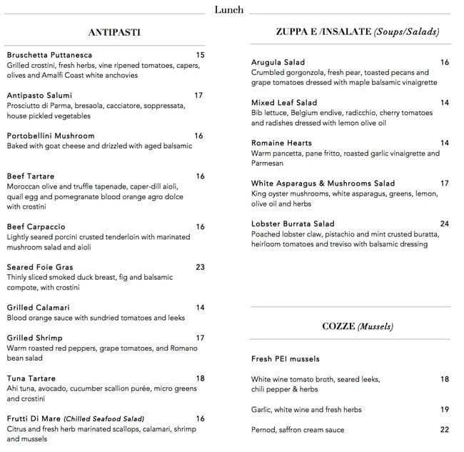 Great food, ambience and services. Most of the dishes are delicious, fresh and executed very well. My favorites are the grilled calamari, grilled prawns and saffron risottos with seared scallops. Bread and side dishes are also very decent. Highly recommended for business lunch. Service was very attentive and efficient.