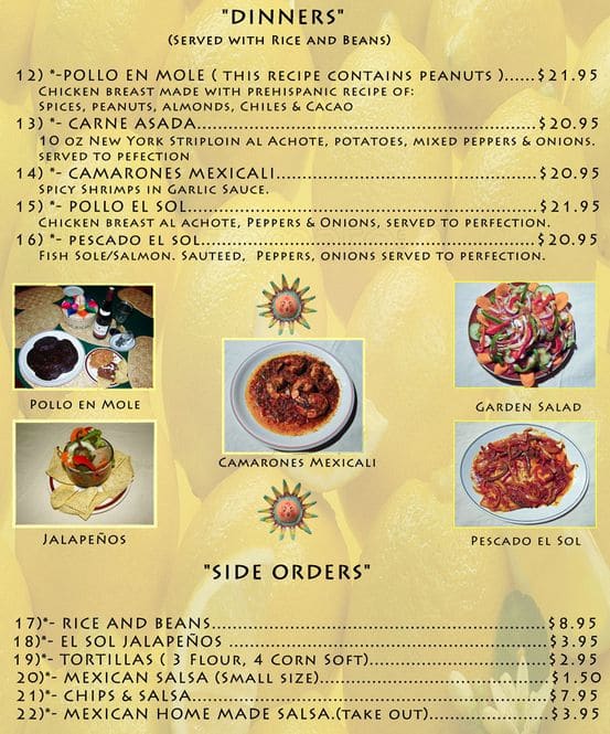 El Sol is an intimate, vibrant eatery nestled in the heart of Toronto, Ontario, Canada, serving up authentic Mexican cuisine. Known for its lively atmosphere and colorful decor, this local gem offers an array of traditional dishes and innovative creations, meticulously prepared using fresh ingredients. Whether you’re craving zesty tacos, succulent moles, or refreshing margaritas, El Sol promises a delightful culinary adventure.
