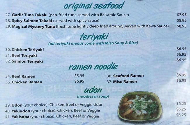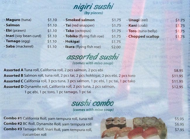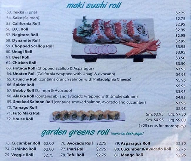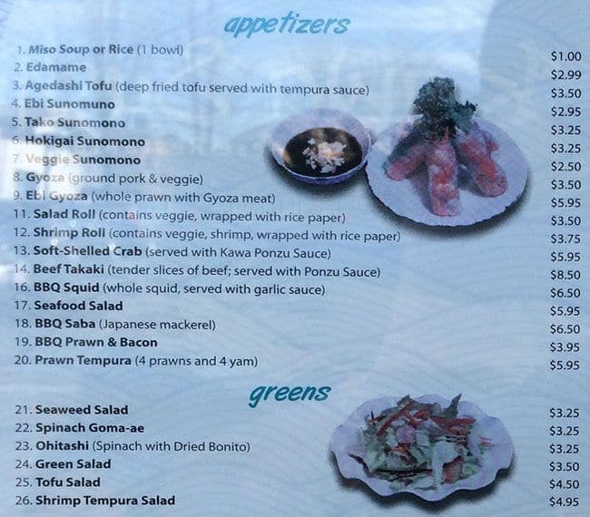 This was our first time to eat Japanese food here. We saw a high rating on Yelp, so we decided to give it a try. When we stepped into the restaurant, I almost tripped on the floor due to a folded door mat. It was around 8pm. Two of us ... grabbed a table right away. I noticed their chairs were not very clean. There was rice on a chair that was next to me. The cup of tea had some dry rice on the surface. Yick! We looked at a hard copy of their menu and pictures on their walls with prices. Our first impression was "Wow!" Their pricing was relatively cheap and the photos made the food look very delicious. We ordered a box 6 half house roll bento with miso soup, assorted sashimi, and a jumbo roll. All the sashimi had a decent size, but I had to spit out the "tendon" between the fish meat. Although I was chewing on the sashimi for a long time, I couldn't swallow it, because it was too chewy. Only the salmon sashimi was better that I didn't have to spit out anything. I could not taste the freshness of the sashimi unfortunately. The jumbo roll had cooked crunchy salmon. Probably we ordered a wrong roll. This was the worst roll I had ever had. The bento box was so big that each item had a big portion in the tray. You must say "Wow! This only costs $12.95!" Unfortunately, none of the items stood out to me. Overall, the customer service was good, but the restaurant did not give me a good impression. The food was lacking quality. Quality plays a very important role on any type of food. The presentation of the food was okay. But I would rather pay more to eat a better qualify of food. I will probably go somewhere else to eat better Japanese food. Read more