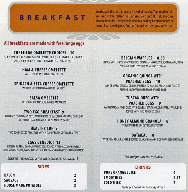 Very friendly, great service. "We are best known for our Eggs Benny, but if you like something sweet the Belgian Waffles are my favorite!" We were told as we walked through the door and he couldn't have been more spot on. The coffee is strong and the food is great, we ... will be back @ Moonpennies. Read more