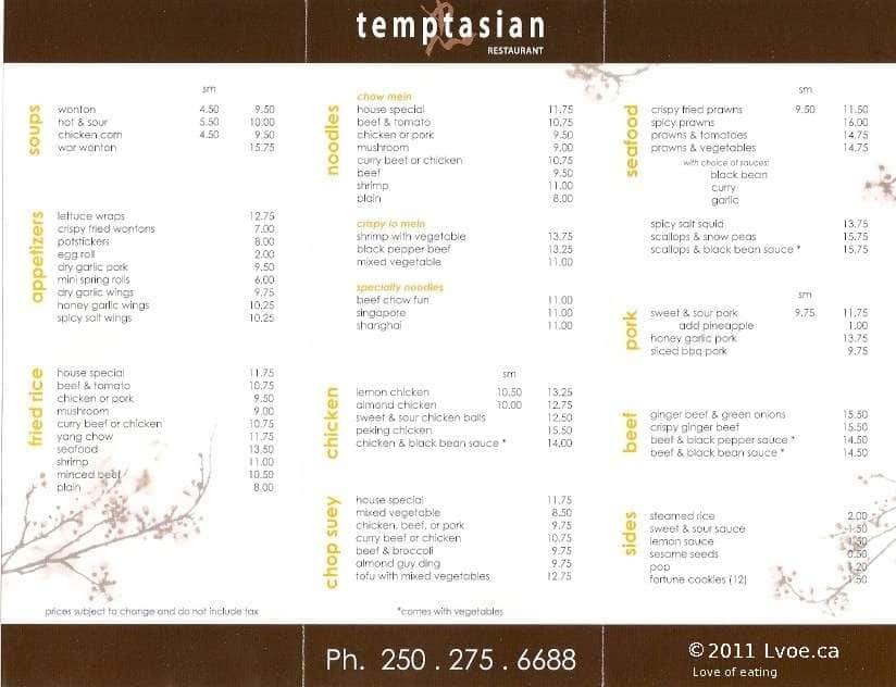 Our group of four had never been to Temptasian before despite it being in Vernon for ten years. We had been informed the the owners want to retire so the restaurant is closing at the end of August 2021. This restaurant previously had a reputation of being the most expensive Chinese ... food restaurant in town. We were all pleasantly surprised by the reasonable prices. I would say it's on par with all other Chinese food prices. The ice cream serving was surprisingly big given the cheap price. The Singapore noodles were unexpectedly spicy for someone else who doesn't eat spicy food. Overall, very clean restaurant and a very big venue. It's a very welcome space during the pandemic. It also was one of few restaurants open Tuesday August 3rd for dine in as most restaurants have shifted to take out only. I recommend this restaurant. Read more