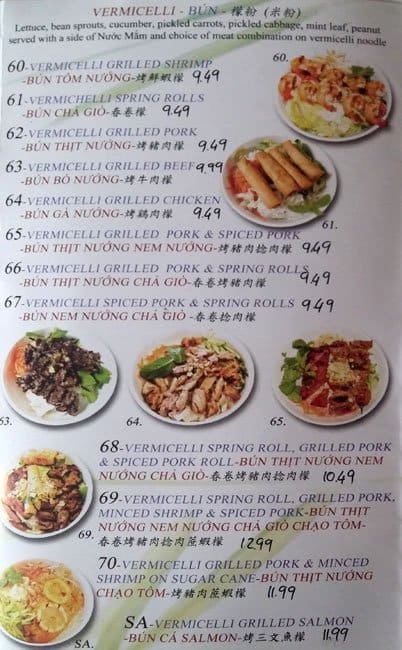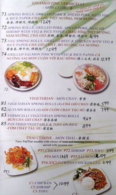 This place is located near the University of Windsor and is a popular spot for a quick meal for many students. The food was fairly good; my wife and I got #55 and #64, rice/vermicelli with grilled chicken. I was surprised the prices vary so much between the options since I ... thought the price would be the same for the same dish just substituting rice/vermicelli. The average price for a dish here would be around $15 give or take, but the portions were larger than I remembered plus there was a lot of meat that came with the dishes. The service was fairly friendly, from the waiters to the front desk. We did not have to wait long when we went on Sunday near noon. The atmosphere was clean, but nothing special. Overall, I would recommend coming here for some Vietnamese food. However, I did hear rumors that the owner keeps the tips, but it could just be rumors.... Read more