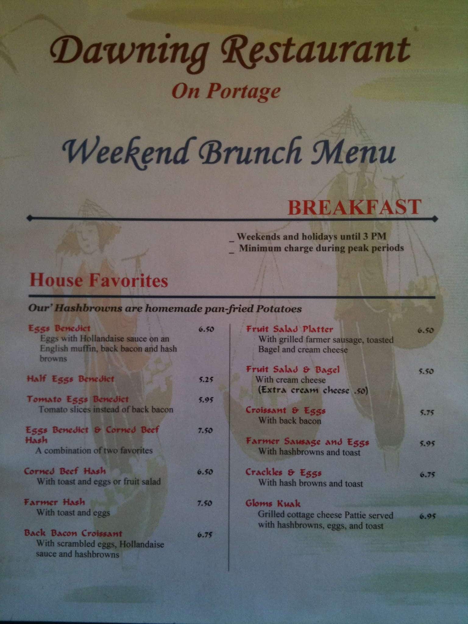 05/16/2024. The Dawning is a great family restaurant. My better 1/2 and my stopped in for breakfast at about 8:15 am. They have an excellent breakfast special that includes coffee. The was quick and friendly. The breakfast was served hot and the coffee was refilled on a regular basis. The ... cost is exceptional at $35 including a 15% tip! Read more